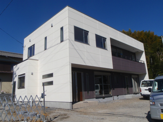 そして完成したのが白地にブラウンが目を引く2階建て二世帯住宅です。